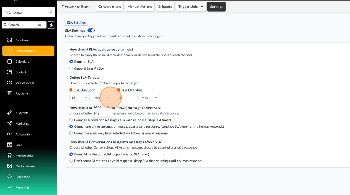 You can set SLA’s either across all conversations or by channel type, Common applies to all and selecting channel will allow you to set SLA’s depending on whether its an email, WhatsApp or text message.