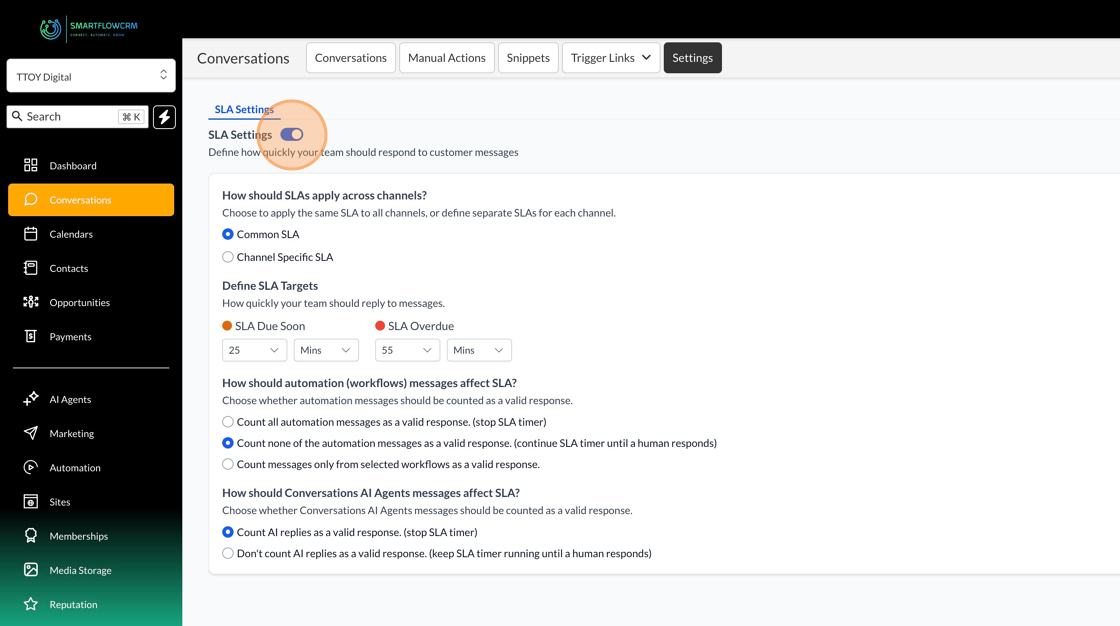 Before you can set your response time warnings you have to enable SLA’s by using the toggle button. This will then allow you to decide on your warnings and when conversation should show when a conversation is overdue.