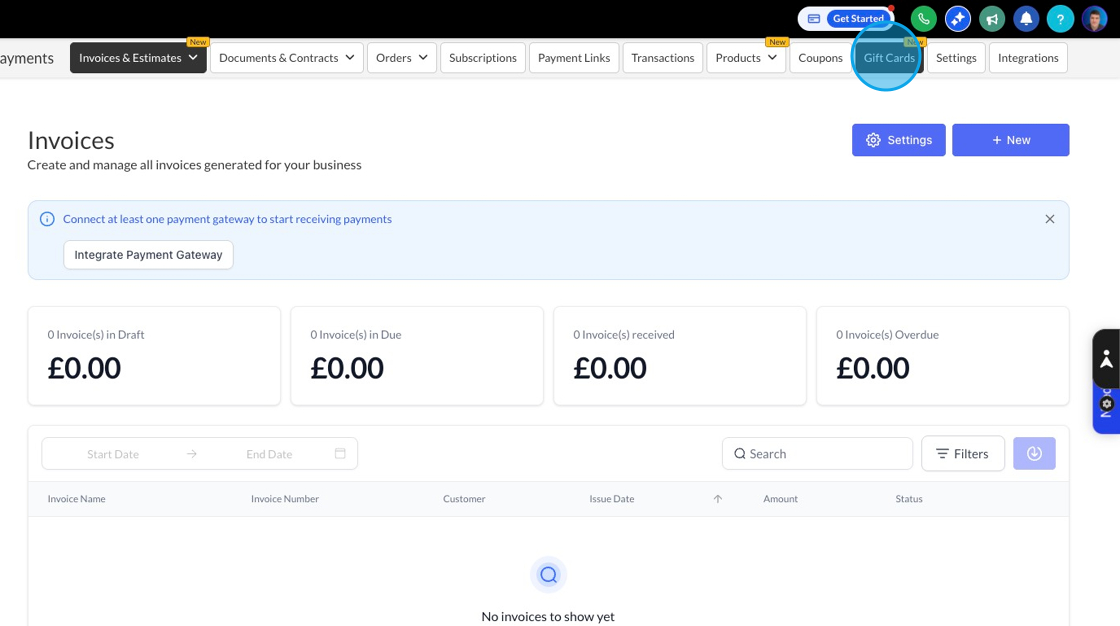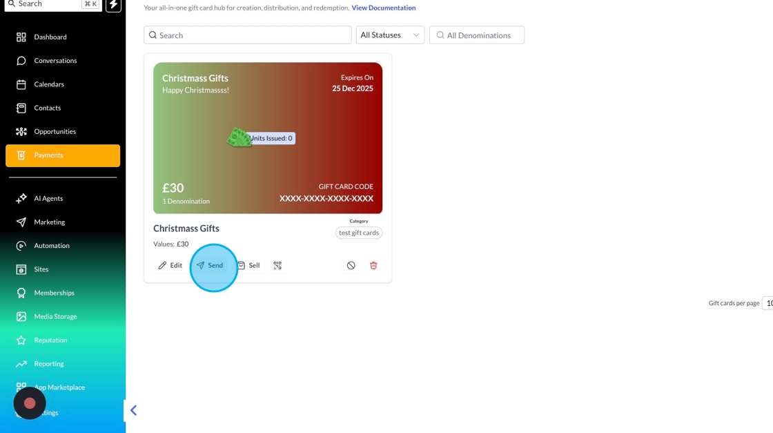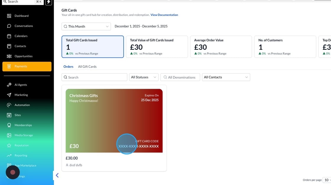 The gift card dashboard lets you see all the gift cards you've sent, along with the stats of how many have been sent, total value and number of customers, so you can keep track of all your cards in one place.