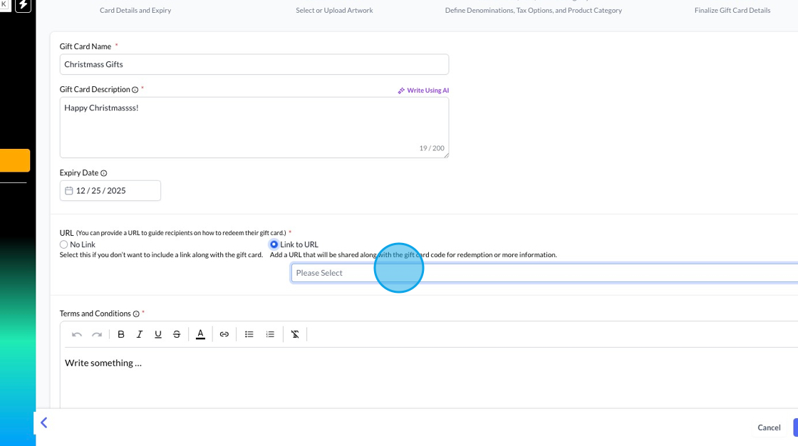 If you want to add terms and conditions, such as eligibility or redemption rules, you can add them in the Terms and Conditions box.