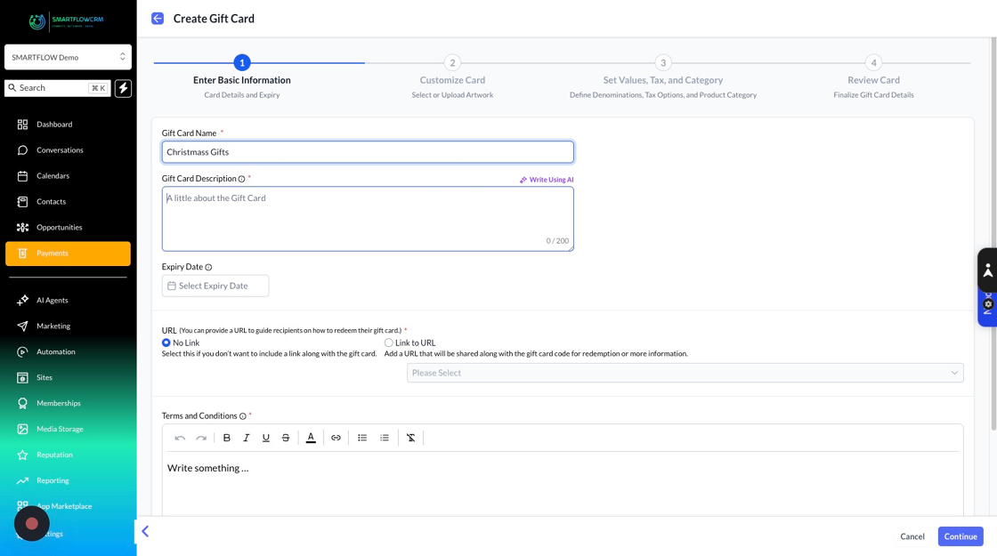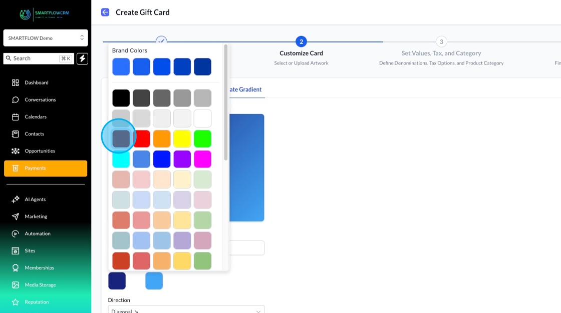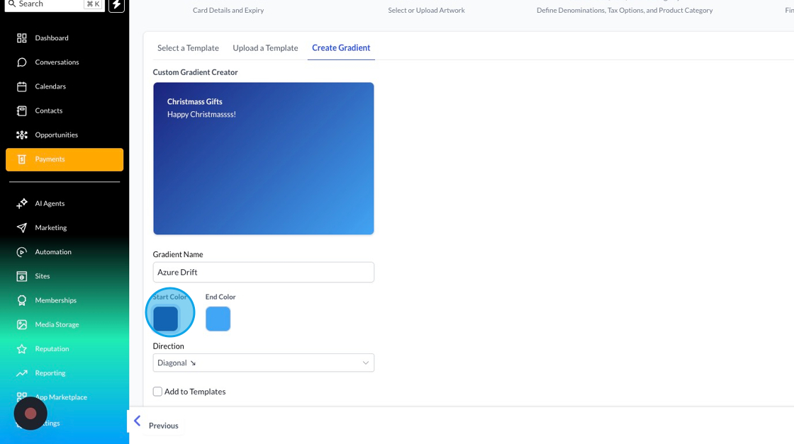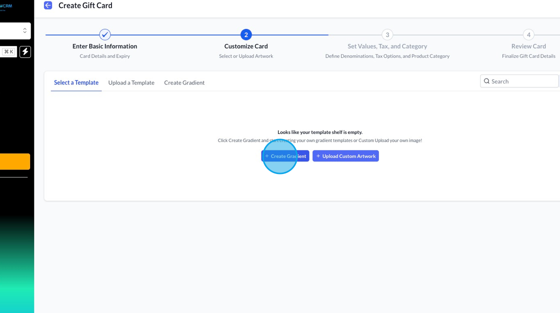 You can either create a gradient design for a card or upload your own design and apply it to your gift card. To get started, click the create gift card button, and you’ll go into the wizard that helps you build your card and set everything needed so it’s ready for use.