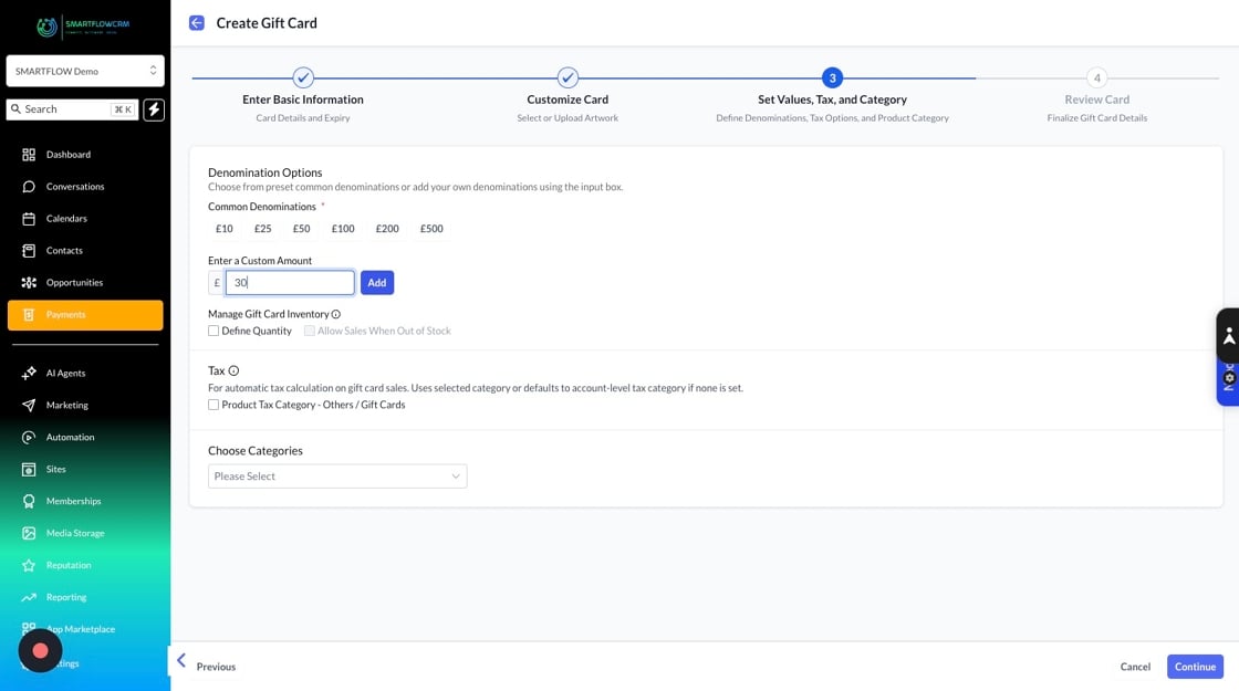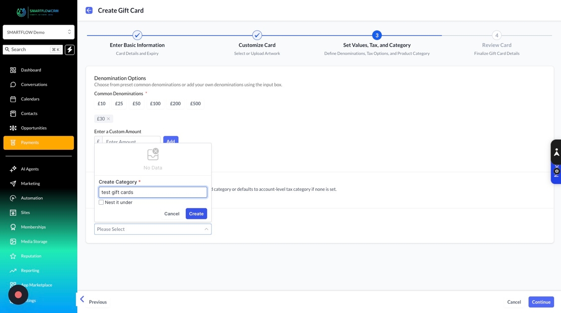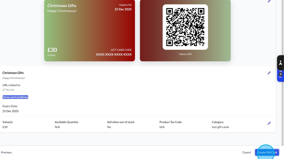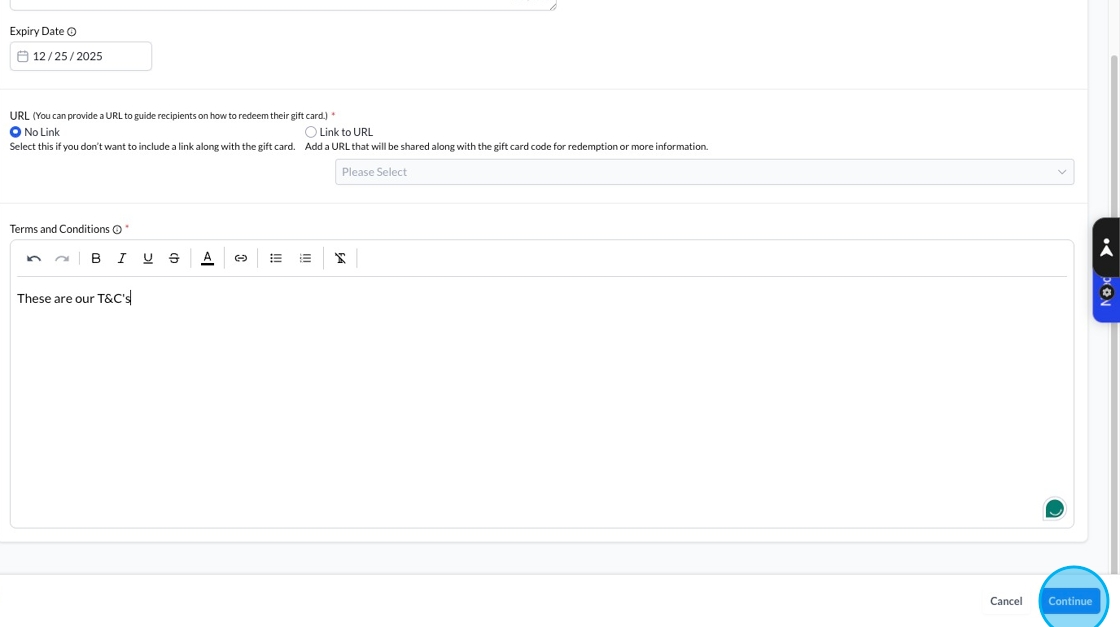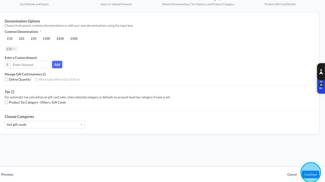 Once you're happy with your denominations, click continue to review all your settings and preview your new gift card.