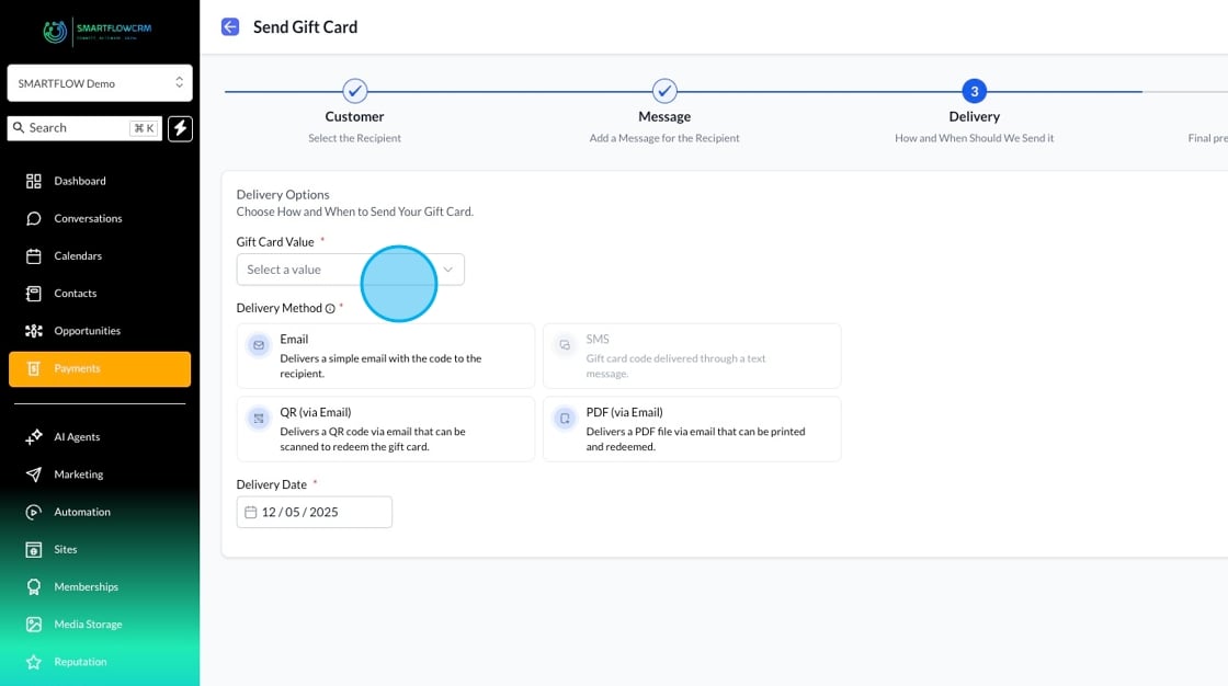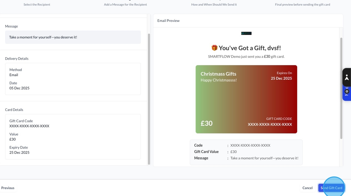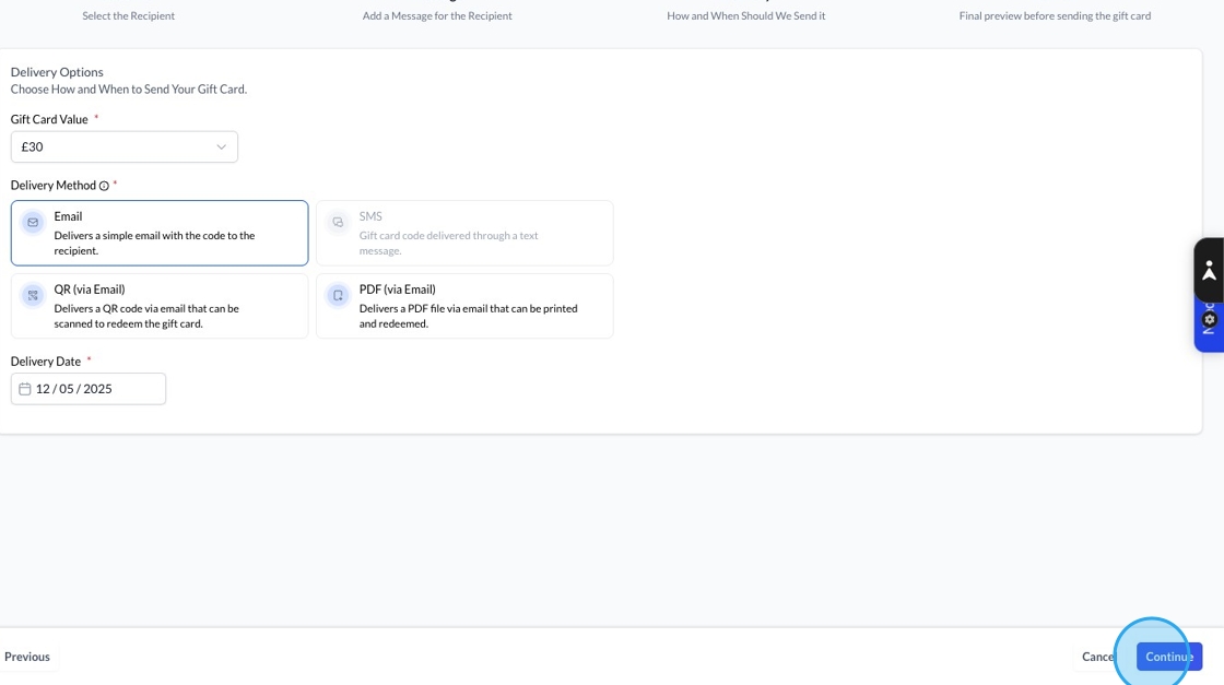 Once you're happy, you can move on to the delivery settings. Select a card value (if you’ve set multiple values for the card, they’ll display here) and choose how you want the card sent: email, QR code, SMS, or PDF. You can also decide when to deliver your card.