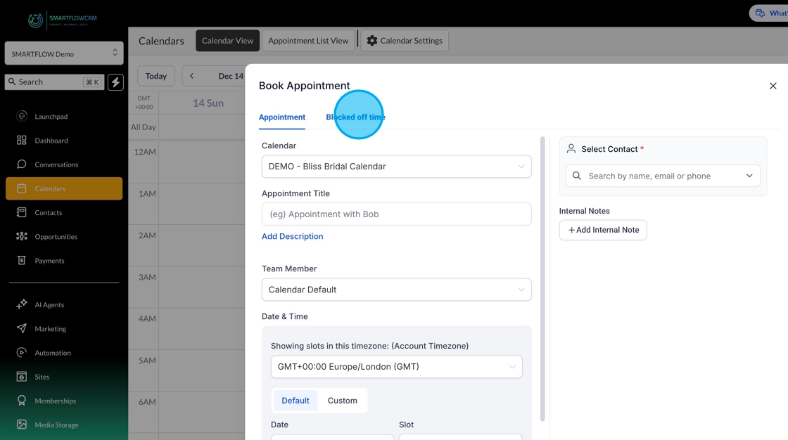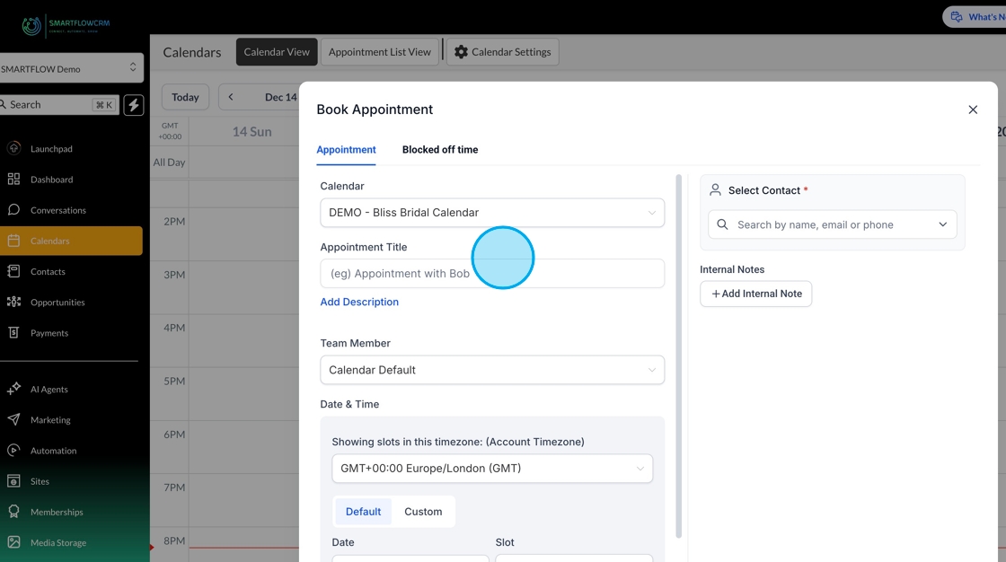 SmartFlowCRM lets you book appointments automatically via workflows, have your customers self-serve via a link, or book them manually yourself, either on a customer’s behalf or to block dates out.