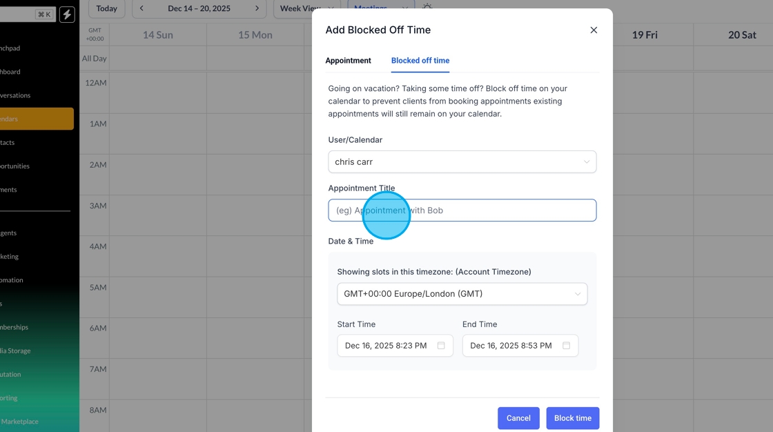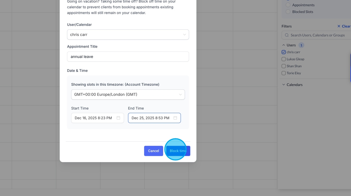 Once completed. Click the block time button to save the blocked time in the calendar.