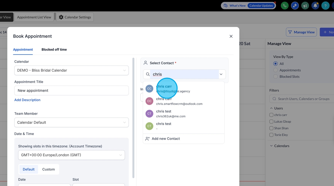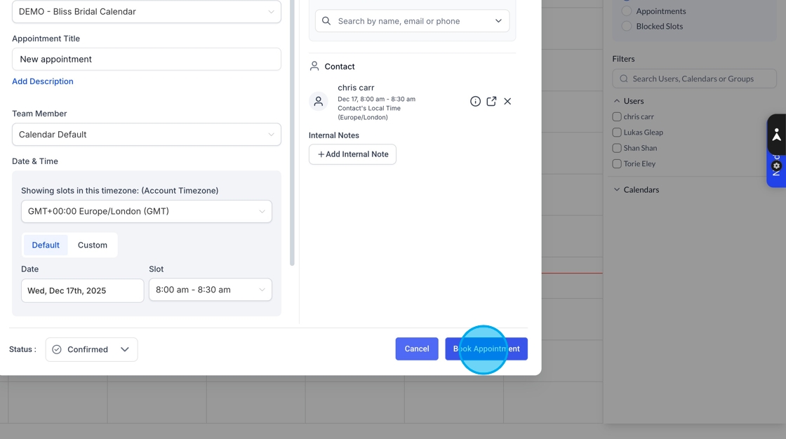 Once a contact has either been selected from the drop-down or created, you can click Book Appointment.