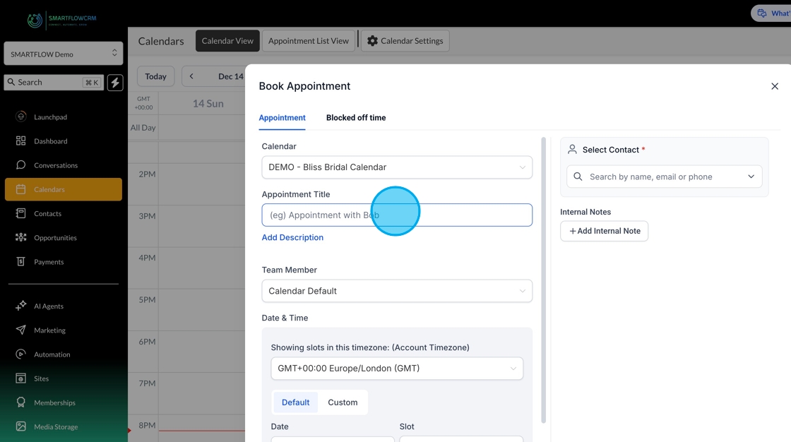 Once the booking screen opens, you’ll be able to add the specifics of the appointment, starting by selecting the calendar you want to book from the drop-down.