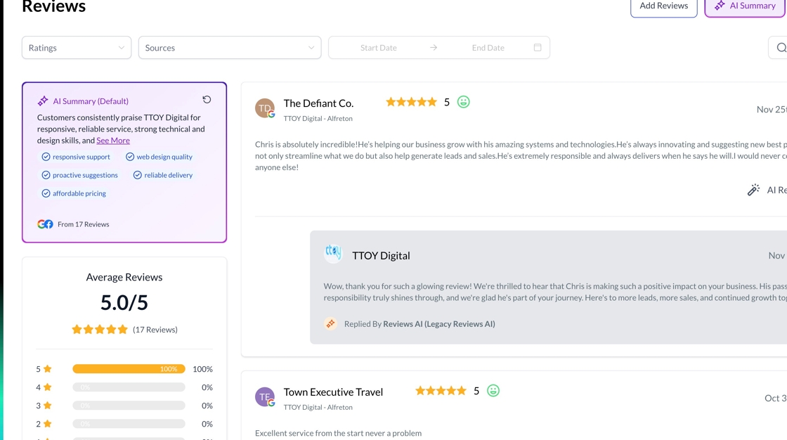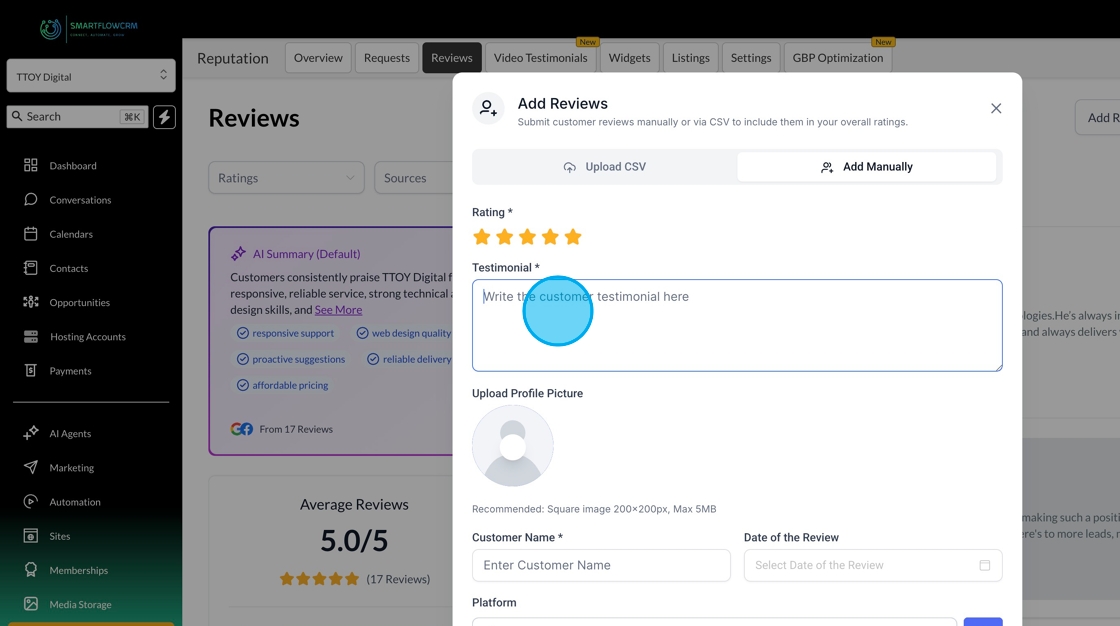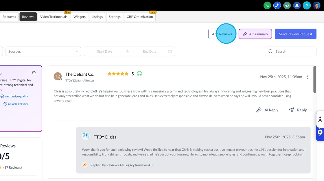 You can link multiple platforms to SmartFlow's reputation management module. There may be occasions when a customer leaves a review on a non-integrated platform, and you want to display it in the widget.