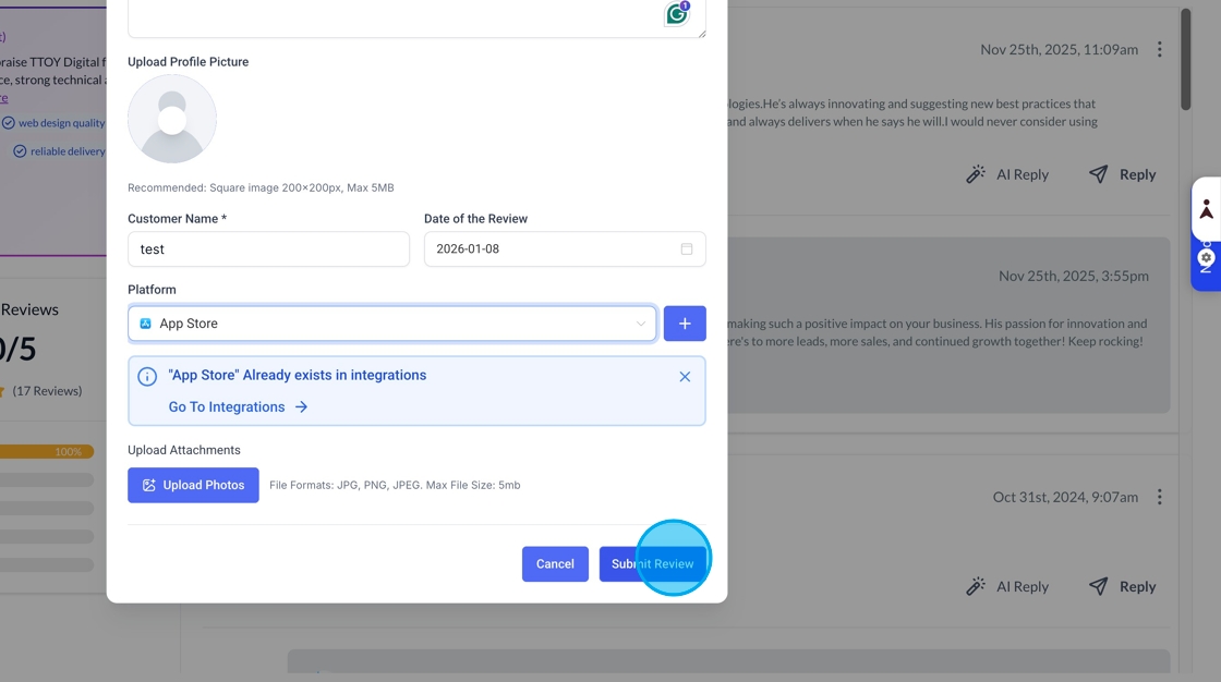 You’ll then be able to add all the details of the review, upload a profile image, include a platform and also any other images.