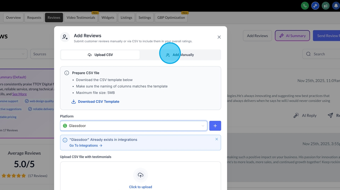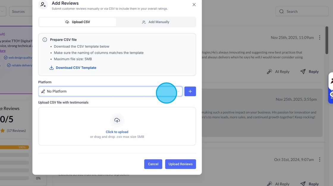 To add reviews in bulk, download a CSV file and add all the reviews.
